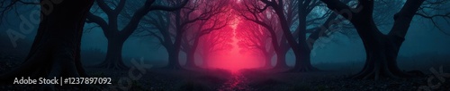 © Chanchai, Fototapeta premium Dark forest with twisted tree branches above a glowing red light source, eerie, glow