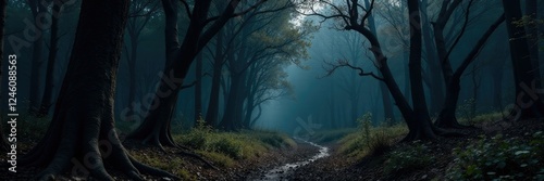 Obraz premium Dark forest with twisted tree trunks and bare branches, wilderness, black