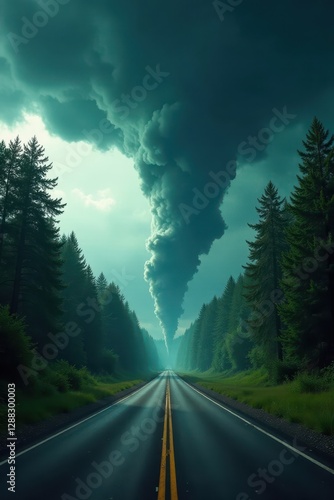 © dadtophoto, Fototapeta premium Dark funnel cloud twists down highway amidst towering stormy trees and debris scattered everywhere, thunderstorm, nature