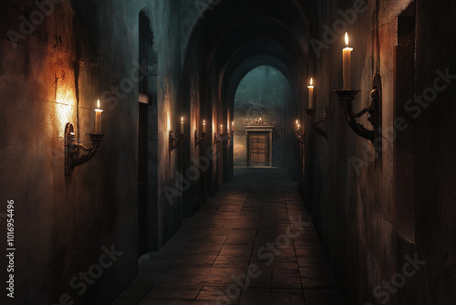 © tynza, Fototapeta premium Dark gothic castle hallway, long and narrow with flickering candles lining the walls, eerie silence.
