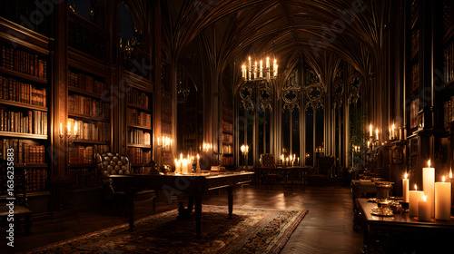 Fototapeta premium Dark Gothic Library Interior with Candlelight
