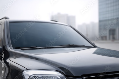 © artbot, Fototapeta premium Dark gray car in front of modern buildings