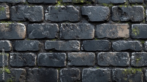 Fototapeta premium Dark gray industrial brick wall with moss and dampness in urban setting