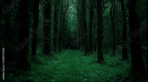 Fototapeta premium Dark Green Forest Path Mysterious Woodland Scene
