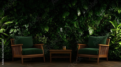 © Arthur Constantine, Obraz premium Dark Green Garden Lounge with Wooden Chairs