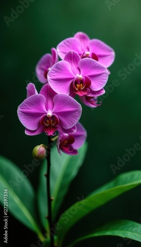© Machita, Fototapeta premium Dark green leaves and branch of pink orchids in landscape format, greenery, branches, botanical