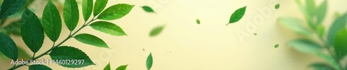 Naklejka premium Dark green leaves scattered on beige background, verdant, ambient