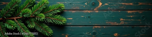 Fototapeta premium Dark green spruce bough, weathered wood plank, weathered, organic, nature