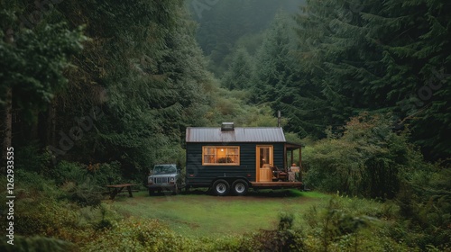 © Yopi, Fototapeta premium Dark Green Tiny House in Lush Forest Park