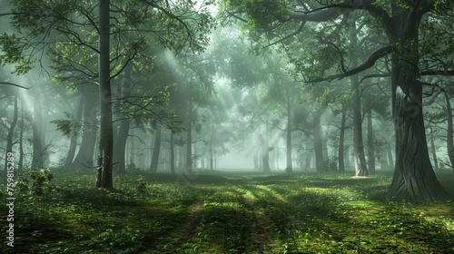 © lelechka, Obraz premium Dark green Wet misty road trough forest after rain