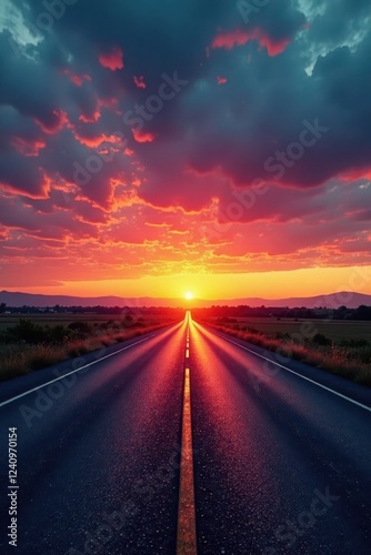 Naklejka premium Dark grey asphalt contrasts vibrant sunset sky, photograph, path