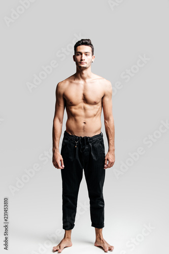 © Leika production, Fototapeta premium Dark-haired handsome young dancer with bare torso wearing a black sports pants is standing on a white background