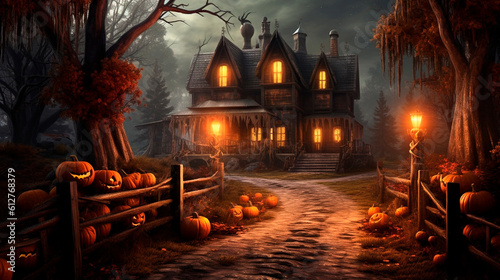 Obraz premium Dark halloween background with pumpkins. Generative AI,