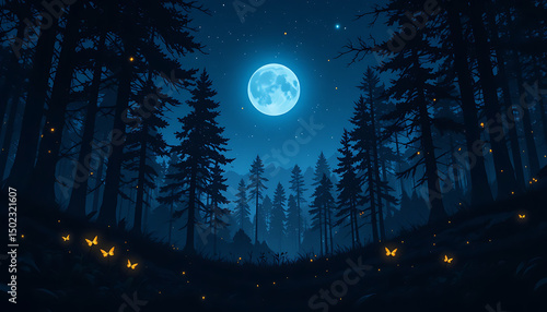 Fototapeta premium Dark Halloween night landscape with full moon, stars, and silhouetted trees