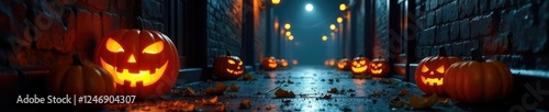 Naklejka premium Dark hallway with cobwebs and jack-o'-lanterns, festive season, Halloween decorations