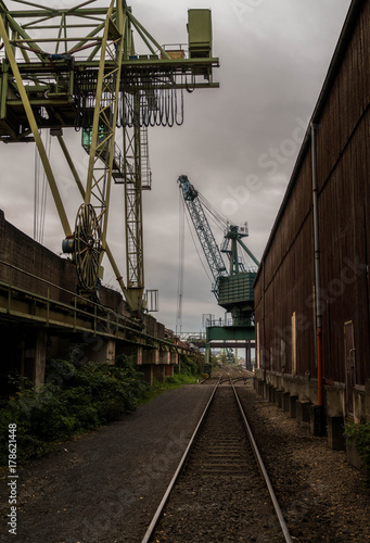 © schemev, Naklejka premium Dark harbour with cranes and train rails