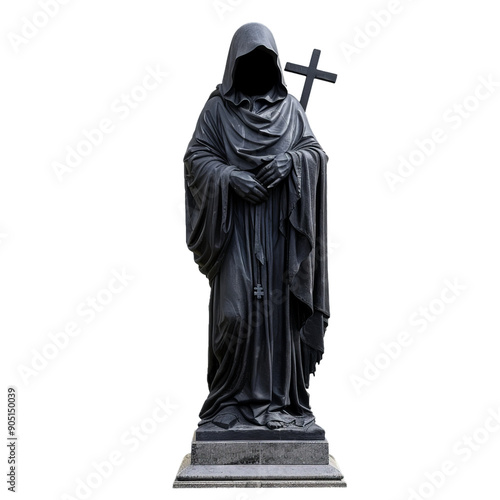 © nsit0108, Obraz premium Dark hooded figure statue holding a cross, isolated on white background