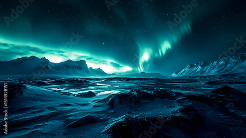 Naklejka premium Dark Icy Landscape Under the Glow of the Northern Lights