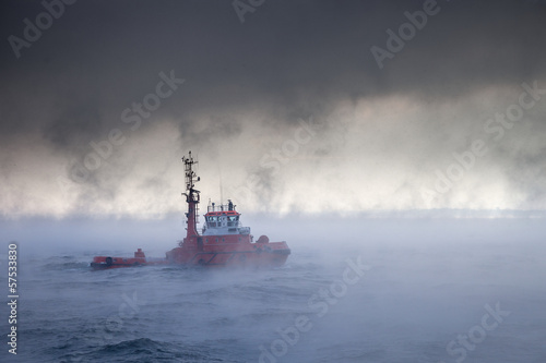 © Nightman1965, Obraz premium Dark image of ship on sea during a violent blizzard.