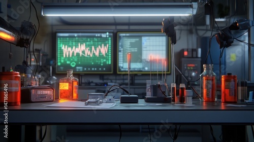 Fototapeta premium Dark Lab Bench Experiments at Night