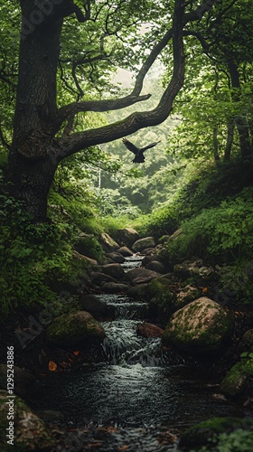 © Starlight, Obraz premium Dark Lush Forest Stream with Bird in Flight