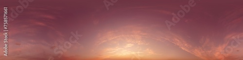Obraz premium Dark magenta sunset sky panorama with pink Cirrus clouds. Seamless hdr 360 panorama in spherical equirectangular format. Full zenith for 3D visualization, sky replacement for aerial drone panoramas.