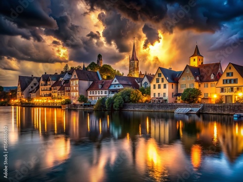 © prapatsorn, Fototapeta premium Dark Medieval Coastal Town at Night, Dramatic Sky, Glowing Windows