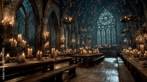 © Marina Darina, Fototapeta premium Dark medieval dining hall illuminated by candles and stained glass
