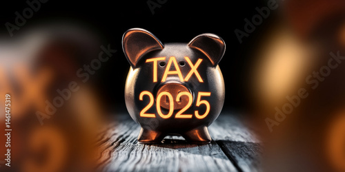 © Mirivox, Naklejka premium Dark metal piggy bank displays "TAX 2025" Illuminated, symbolizing financial planning and tax season preparation for the new year