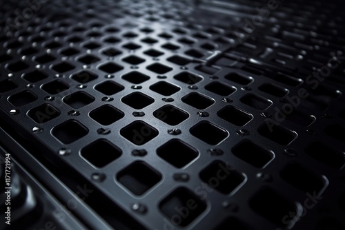 Obraz premium Dark metallic grid surface with intricate patterns and shadows,