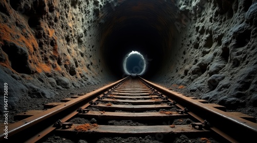 Naklejka premium Dark mine tunnel with light, a railroad track leads into a dimly lit mine shaft with a bright light at the end, symbolizing exploration, resource extraction, and the path to a goal.