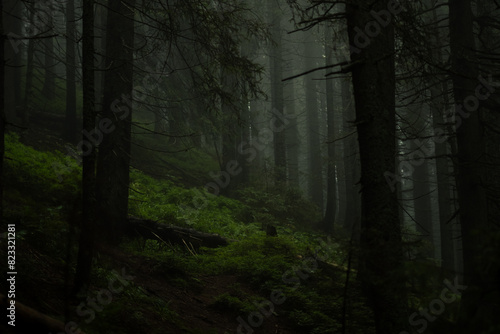 Obraz premium Dark, misty forest with dense trees and lush green undergrowth