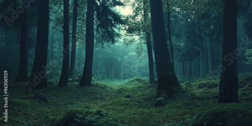 © Murda, Obraz premium Dark, misty forest with tall trees.