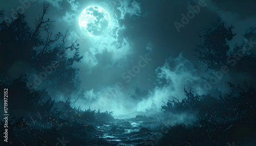 Fototapeta premium Dark misty Halloween background with mysterious shadows, glowing moonlight...