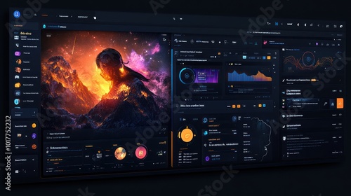 © Alienmarsh, Obraz premium Dark Mode Dashboard UI Design with a Surreal Background