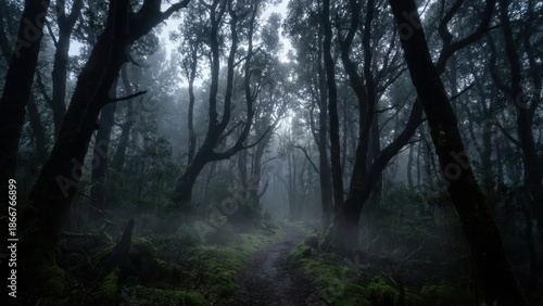 Obraz premium Dark Moody Forest Path With Tall Trees For Mysterious Nature Concept Background
