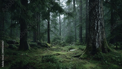 © darshika, Obraz premium Dark moody forest scene with mossy floor