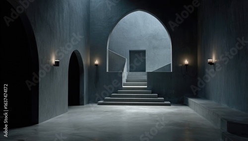 Obraz premium Dark, moody interior with arched doorways and stairs