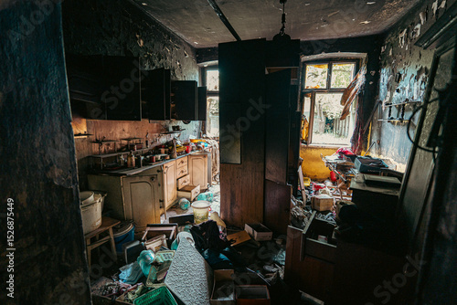 Naklejka premium Dark, moody kitchen in an abandoned house, filled with scattered and dusty objects. A chaotic scene frozen in time and decay.