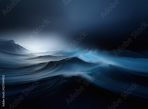 © Echo of Dreams, Fototapeta premium Dark, moody seascape with blurred waves moving towards a bright light source in the background. Dramatic atmosphere and dark blue hues create a serene scene.