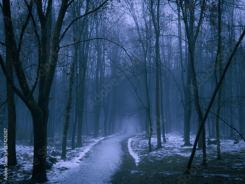 © Nazarii, Fototapeta premium Dark mysterious forest with snow at dusk. Path through the evening woods. Silhouettes of leafless trees.