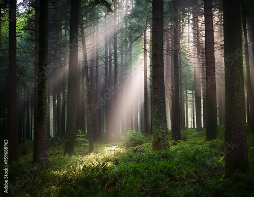 Obraz premium Dark mysterious forest with sunlight passing through the trees