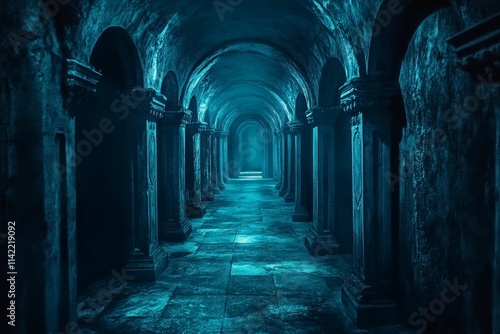 Fototapeta premium Dark, mysterious hallway; arched ceiling, stone columns.