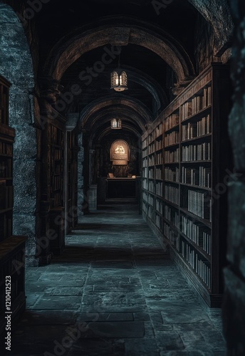 © Dzikrul Husnani, Fototapeta premium Dark Mysterious Library Hallway with Ancient Books