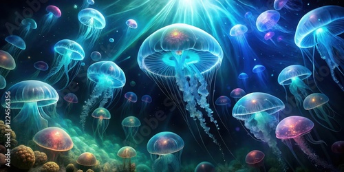 Naklejka premium Dark mysterious ocean depths with glowing jellyfish and bioluminescent...