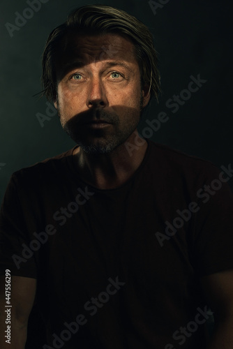 Fototapeta premium Dark mysterious portrait of a blond man with light blue eyes and