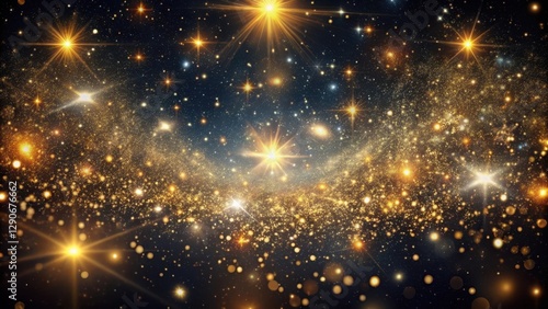 Naklejka premium Dark mystical abstract background with intricate gold sparkles scattered in a chaotic pattern , universe, cosmic, universe