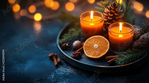 © ThisDesign, Obraz premium Dark navy blue background with warm orange bokeh lights, studio lighting generative ai