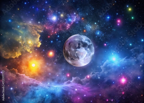 © chokdeelaw, Obraz premium Dark nebula against a vibrant starry sky with numerous constellations and a full moon