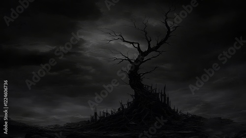 © Big9869, Fototapeta premium Dark Night, Barren Tree Over Ruins, Gloomy Landscape